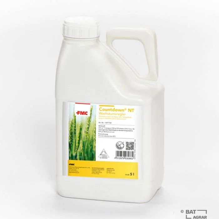 Countdown NT ist ein Wachstumsregler im Getreide- und Gräseranbau. Der Wirkstoff Trinexapac-ethyl wird schnell über die grünen Pflanzenteile aufgenommen und in das aktive Gewebe (Meristemzellen) transportiert. Durch die wachstumsregulierende Wirkung wird das Längenwachstum der Internodien gehemmt und die Pflanzenhöhe reduziert.