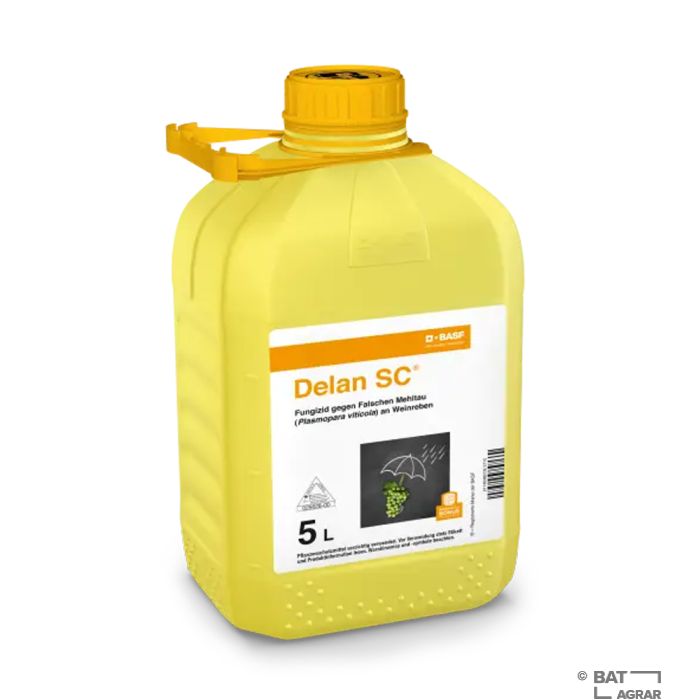 Delan SC ist ein Fungizid mit dem Wirkstoff Dithianon. Das Pflanzenschutzmittel wirkt vorbeugend und unterbindet die Keimung der Sporen wobei der Wirkstoff gleichmäßig und stabil an der Pflanze haftet. Delan SC ist in der empfohlenen Aufwandmenge im Weinbau gut verträglich.