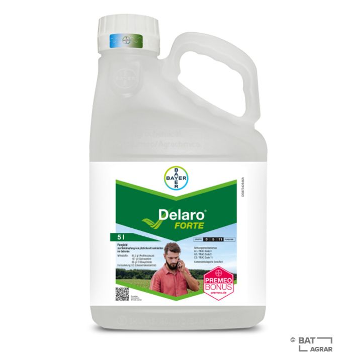 Delaro® Forte ist ein Fungizid um pilzliche Krankheiten im Getreide zu bekämpfen. Das Pflanzenschutzmittel ist breit wirksam gegen alle Ähren-, Blatt- und Halmkrankheiten und dank der Leafshield Technologie sehr gut formuliert. Delaro® Forte enthält die drei Wirkstoffe Prothioconazol, Spiroxamine und Trifloxystrobin.