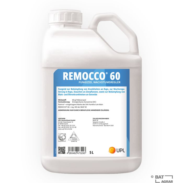 Remocco 60 ist ein systemisches Fungizid gegen Krankheiten in Getreide und Raps. Zusätzlich kann Remocco zur Wuchsregulierung in Raps und zum Stauchen an Zierpflazen verwendet werden. Der Wirkstoff Metconazol dringt schnell in die Pflanze ein und wird in der kompletten Pflanze mit dem Saftstrom verteilt. Das schnelle Eindringen in die Pflanzeverhindert eine Auswaschung durch nachfolgenden Regen. Das Produkt wirkt protektiv vor einsetzendem Befall und vorhandene Infektionen breiten sich nicht weiter aus.