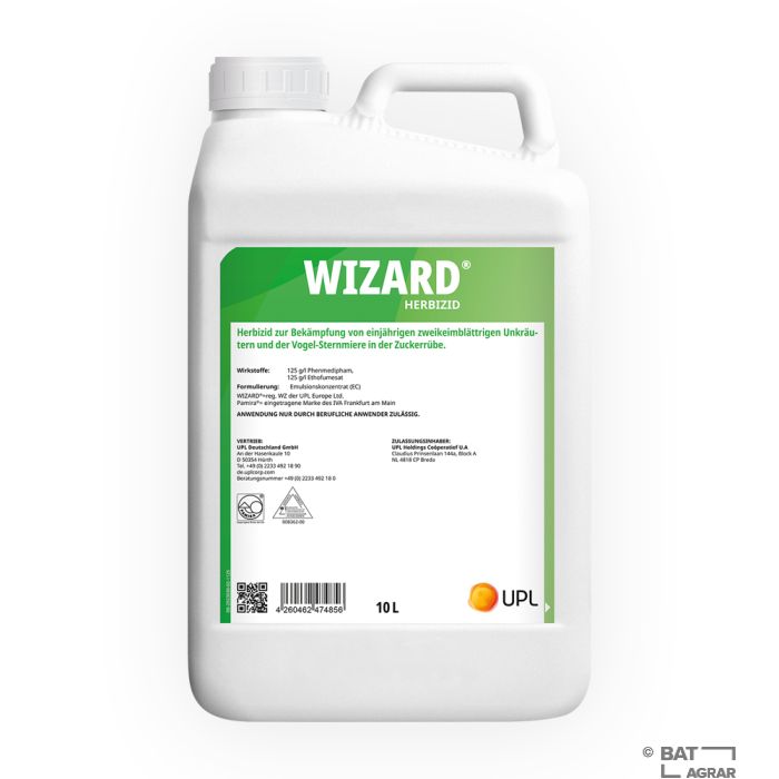 Wizard ist ein Herbizid gegen einjährige zweikeimblättrige Unkräuter, Vogel- und Sternmiere in der Zuckerrübe. Das Pflanzenschutzmittel enthält die Wirkstoffe Phenmedipham und Ethofumesat.